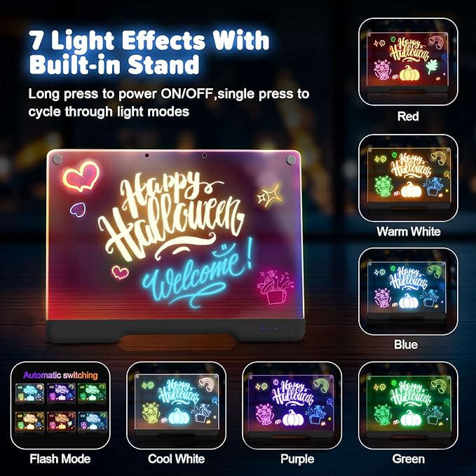 - [Versatile LED Drawing Board]-: Transform your artwork with vibrant neon colors! Switch between 7 different light modes to create captivating and unique glowing effects. It can also be used as a message board, drawing board, or a night light as room decor