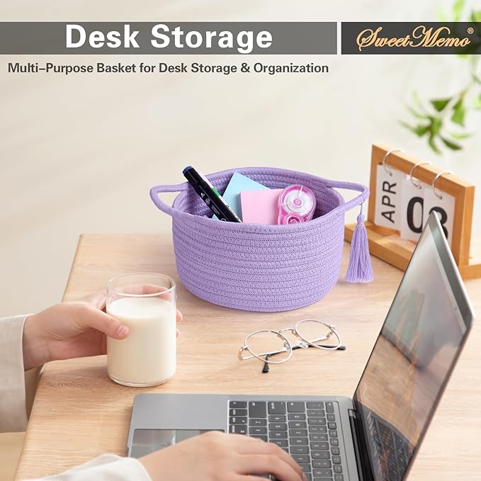 - 【Desk & Bedside Organizer for Girls】This soft purple rope basket adds a dreamy touch to your vanity, desk, or nightstand. Use it to store makeup, jewelry, stationery, or bedtime items like lip balm and scrunchies. The compact size makes it a cute and functional bedside storage bin, catchall tray, or gift basket for girls, especially in pastel-themed rooms or dorms.