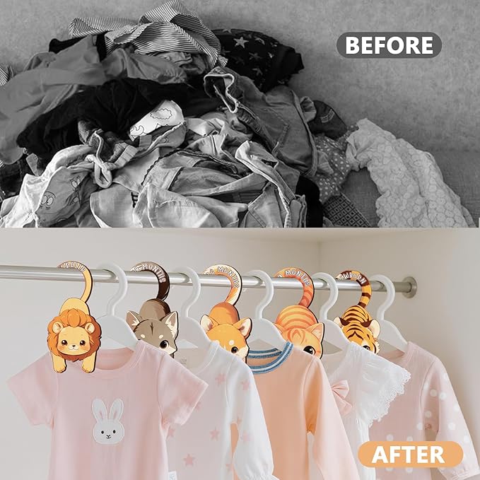 - 【Unique Animals Design】Our baby closet dividers feature an adorable animal theme, with each divider showcasing a unique and charming animal design (8 different animals including cat, tiger, horse, and more!). The back of each divider is blank, allowing for easy DIY customization. The top of the dividers is marked with month information, helping you quickly find the baby clothes you need by age