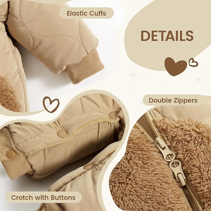 - [🐻Thoughtful Design]: JiAmy snowsuit toddler wear features a front zipper with crotch snaps for swift diaper changes and easy dressing, Fleece lined pockets to keep tiny hands cozy, and ribbed cuffs that lock out drafts while securing sleeves, making these baby winter clothes the practical choice for active kids.