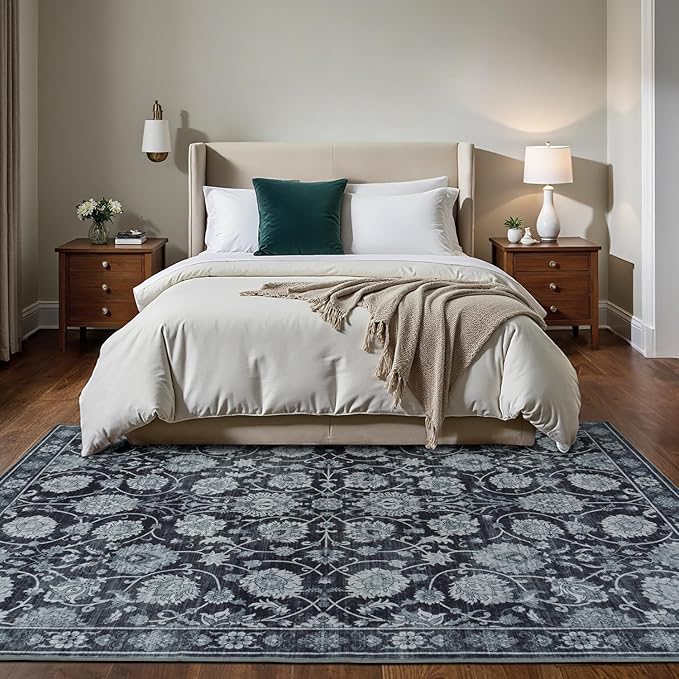 Area Rug 5x7 for Living Room & Bedroom, Large Washable Rugs, Soft & Non Slip, Vintage Carpet, Low Pile Wool Carpets for Indoor Under Table Dining Home Office Nursery Playroom, Black