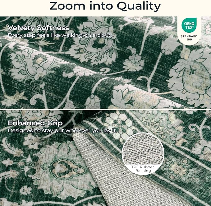 6x9 Area Rug for Living Room & Bedroom, Washable Non-Slip Floral Rugs, Soft Vintage Carpet, Low Pile Wool Carpets for Indoor Dining Home Office Playroom Under Table, Modern Decor, Dark Green