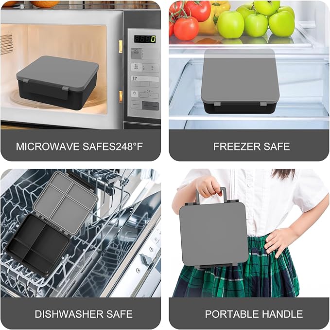 - 【Food Grade Materials】Our lunch boxes and insulated thermo food jar are made of food grade materials, which not only seal and prevent leakage, but also effectively prevent odors,Four sealed compartments can effectively prevent food from cross flavoring each other. food safety is the original intention of our product development.