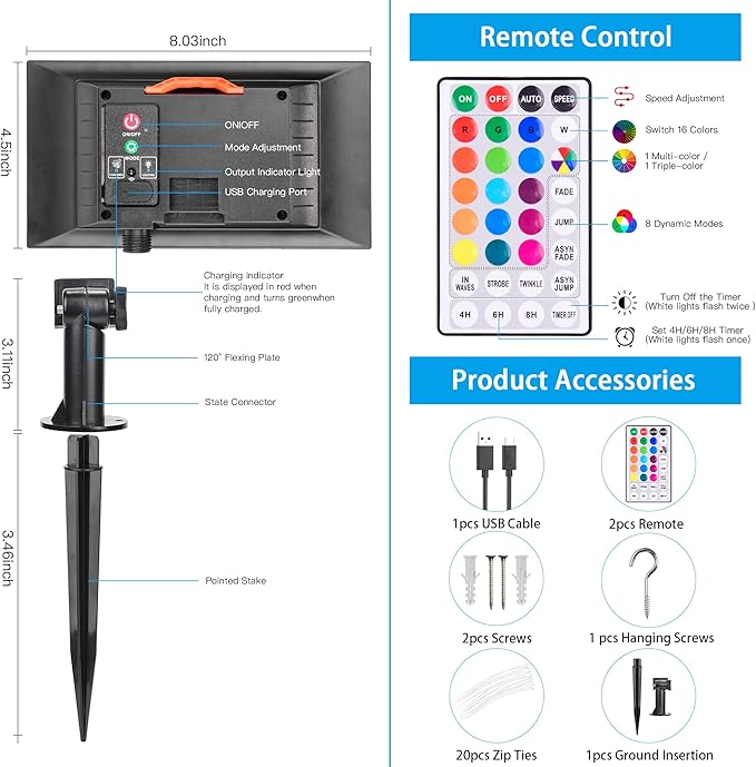 - Large Solar Panel & USB Rechargeable: Built-in a 3600mAh battery and a large-size solar panel, the RGB outdoor rope lights can work up to 10-12 hours when fully charged. Besides, the panel is equipped with a USB charging port to charge the solar panel when in bad weather. Charging time: 8 hours of direct sunlight or 5 hours via USB. The 120°adjustable design of the solar panel allows you to position the panel for direct sunlight. Search ASIN: "B0CZLQP6WN" for rope lights clips
