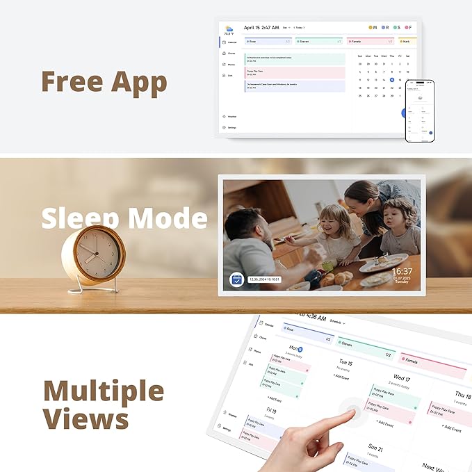- 【Easy Setup and Auto-Sync】: Enjoy a user-friendly design that our smart picture frame allows for quick setup—just plug in, connect to Wi-Fi, and link your calendar to the Mobile App. Once synced, it seamlessly integrates multiple personal calendars (iOS, Google, etc.) into one unified interface. Authorize additional devices for even greater convenience.