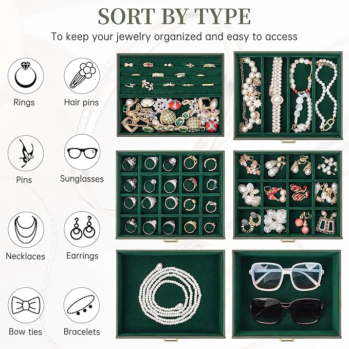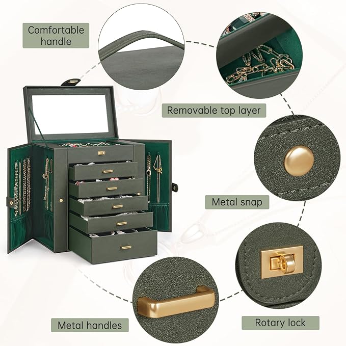 - LARGE CAPACITY:With 6 versatile pull out drawers, this huge jewelry box can store a lot of jewelry accessories, such as rings, earrings, necklaces, chains, bracelets, and so on. One deeper drawer is designed for sunglasses or large jewelries.