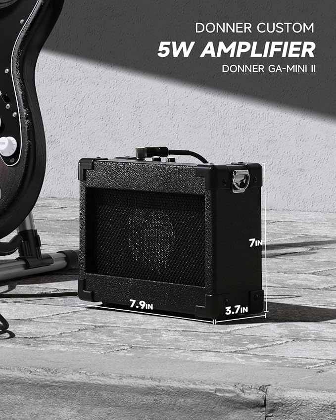 - COMPLETE BEGINNER’S PACKAGE:Open the box, and you’re ready to play. This beginner kits includes the DST-80 electric guitar, custom 5W amplifier, durable gig bag, capo, strap, extra strings, digital tuner, amp cable, picks, and access to free online lessons from Donner to help you grow and shine