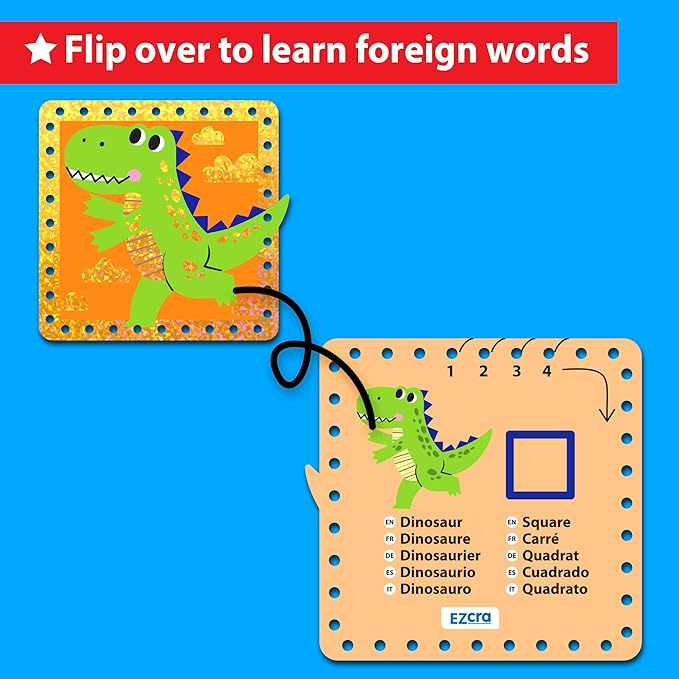 EZCRA Premium Foil Edge Lacing Cards for Kids Ages 3-6 | 10 Double-Sided Animal and Space Sewing Cards with Multilingual Learning | Durable Cardboard Fine Motor Skills Activity Kit