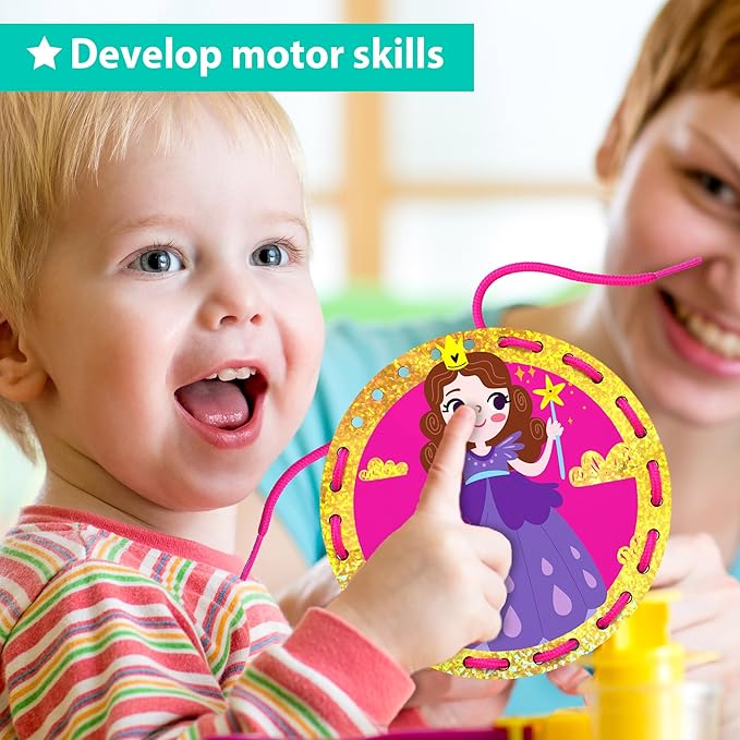 - 🎯Complete Educational Kit🎯 Everything included for immediate play: 5 premium double-sided princess and unicorn-themed cards with pre-punched holes, 5 dual-tip laces, and multilingual learning guides - no additional purchases needed.