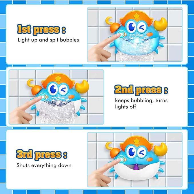 - FUN BUBBLE BATH TOY SET: This adorable crab bubble machine creates a waterfall of bubbles, while colorful LED lights captivate your child’s attention. The wind-up swimming toys add extra bath-time fun, turning washing into a joyful experience.