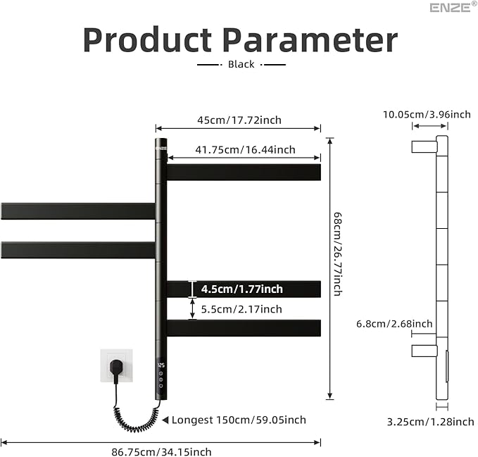 • 【LED Touch Panel with Adjustable Timer & Temperature】 Set the perfect warmth using the heating towel rack’s LED touch screen. Adjustable timer (1–24 hours) and temperature control (115–150℉) keep towels cozy. Use the constant 115℉ mode for all-day warmth on your heated towel bars for bathrooms.