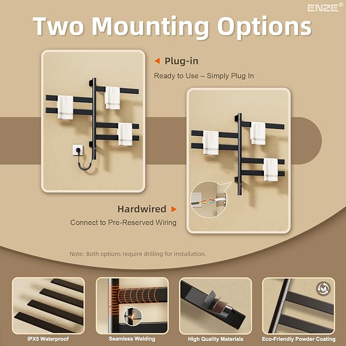 • 【Flexible Installation: Hardwired or Plug-In】 Designed as a hardwired towel warmer or plug-in unit, install this wall-mounted heated towel rack with included hardware and instructions. Great as a towel heater rack or electric towel drying rack for any bathroom setup.
