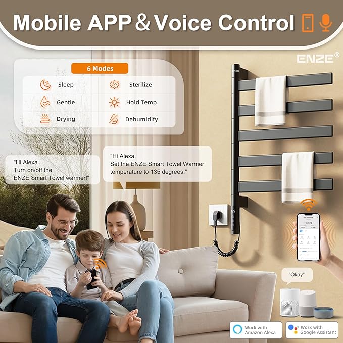 • 【Smart WiFi Towel Warmer with Voice Control】 Control your electric towel warmer anytime via the WiFi towel warmer function through Tuya app, Alexa, or Google Assistant. Experience hands-free convenience with this smart towel warmer designed for modern living.