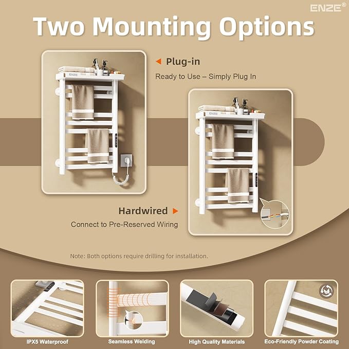 - 【Flexible Installation: Plug-in/Hardwired】 Whether you're retrofitting or renovating, this unit supports both plug-in towel warmer bars and hardwired towel warmer installations. Made of eco-coated low carbon steel, it’s a durable heated towel rack for bathroom, ideal as a wall-mounted heated towel rack or towel bar warmer for bathroom.