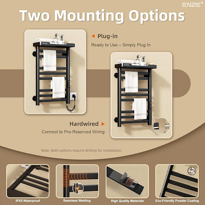 - 【Flexible Installation: Plug-in/Hardwired】 Whether you're retrofitting or renovating, this unit supports both plug-in towel warmer bars and hardwired towel warmer installations. Made of eco-coated low carbon steel, it’s a durable heated towel rack for bathroom, ideal as a wall-mounted heated towel rack or towel bar warmer for bathroom.