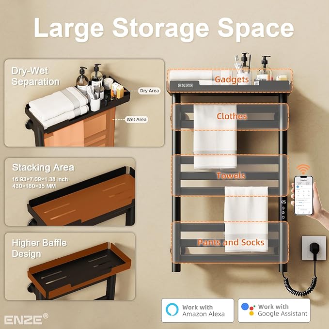 - 【Smart WiFi Towel Warmer with Voice Control】 Control your electric towel warmer anytime via the WiFi towel warmer function through Tuya app, Alexa, or Google Assistant. Experience hands-free convenience with this smart towel warmer designed for modern living.