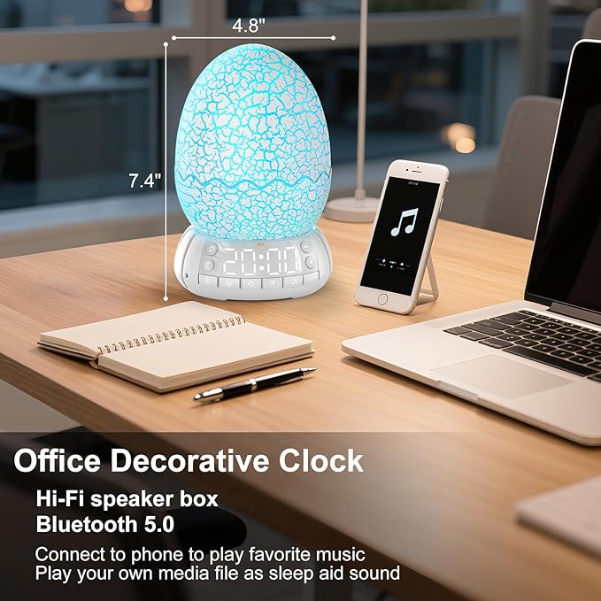 - 【Multi-Function and Usage】It can be used as a digital clock on desk, dinosaur egg night light for bedroom, mini bluetooth speaker, sleep trainer for kids and adult. It's great gift for birthday, anniversaries, Valentine's Day, Easter, Thanksgiving, Halloween, Christmas, etc.