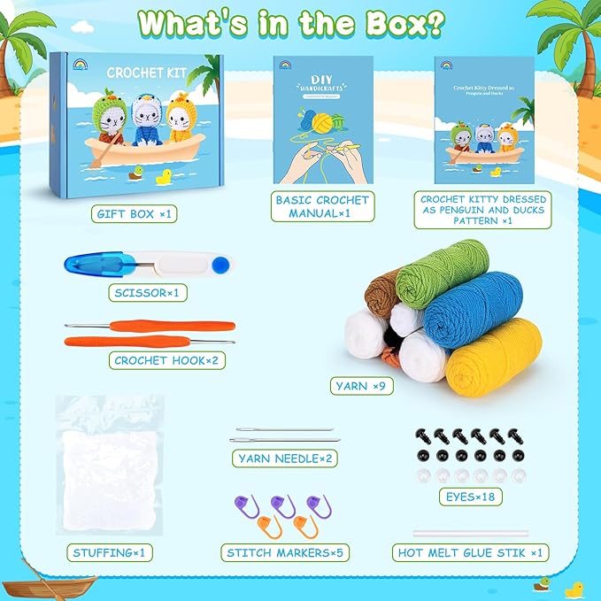 - All-In-One Crochet Starter Kit:Beginner crochet kit comes with everything you need to create cute crochet kit: enough yarn, crochet hooks, eyes, knitting markers, needles, stuffing, scissor, hot melt glue stick. In addition to the crochet supplies, the crochet kit for beginners kids includes beginner-friendly video tutorials, duck and penguin cat crochet pattern and basic crochet manual.