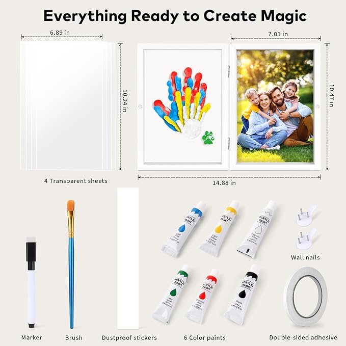 - EVERLASTING FAMILY TIME CAPSULE: Capture the fleeting moments of your child's growth in timeless elegance–each handprint tells a story that grows more precious as the years pass. Create your own artwork for your home with our lovely family handprint kit. Use the paints to print your hands on the insert, then display in the frame included