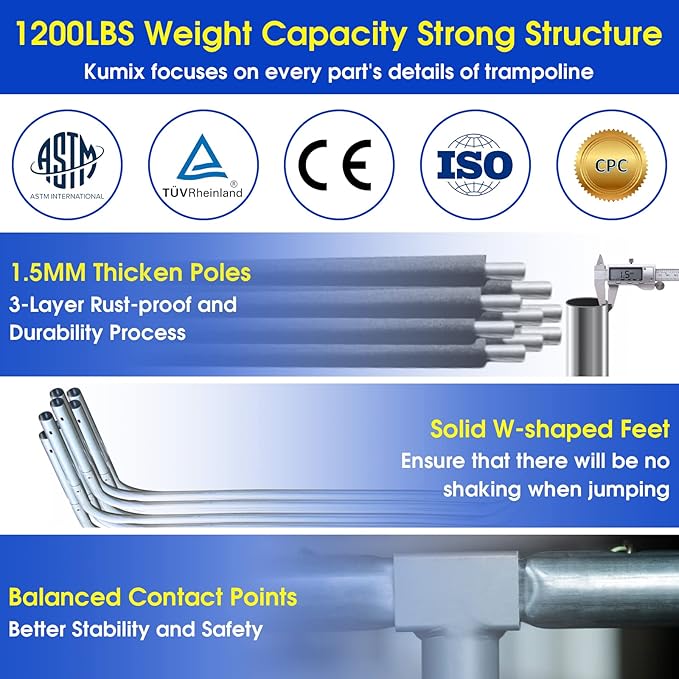 - 👍1200Lbs Max Weight Capacity: SKYUP 12FT trampoline passed ASTM F381-16 Standard Safety Specification for Components, and CPC, Chemical Test. Due to the 8PCS heavy-duty galvanized steel frame, 4 U-legs, and 64pcs galvanized springs, the trampoline is sturdy and can hold a capacity of up to 5-6kids. Advise SINGLE person to weigh no more than 330LBS.