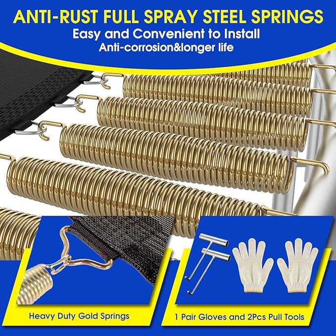 - 👍Upgrade Waterproof Trampoline Material: Added waterproof and anti-UV safety poles foams which can protect the safety poles away being broken, and extend the lifetime of the trampoline. PP spring pad and high-strength woven jumping mat are also waterproof. Extra including 4 set trampoline wind stakes. Greatly reducing the risk of trampolines being broken in bad weather. Reducing your economic loss.