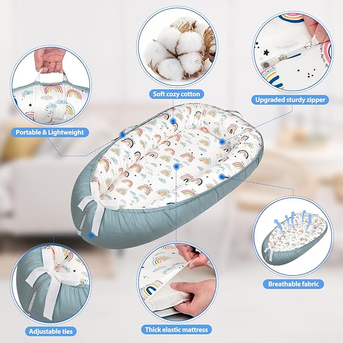 Baby Lounger - Baby Lounger for Newborn 0-24 Months, Breathable & Soft Baby Nest, Portable and Lightweight Lounger for Home and Travel, Ideal Newborn Babies Essentials (Blue-Rainbow)