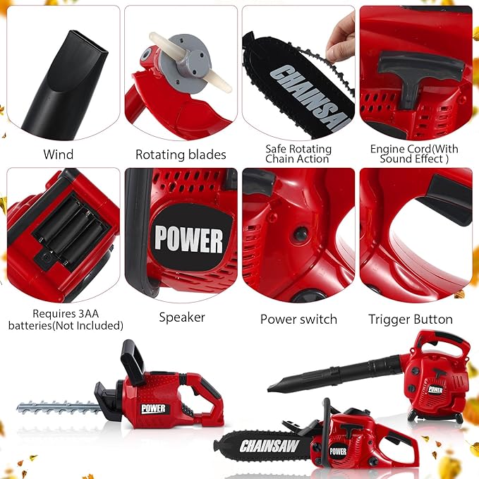 - Complete Play Tool Set for Kids: our kids lawn equipment toys set is a nice bundle to keep your child entertained and engaged; The set includes a fake leaf blower, a fake hedge trimmer, and a fake chainsaw, all designed to match real world models; In bold red and black colors
