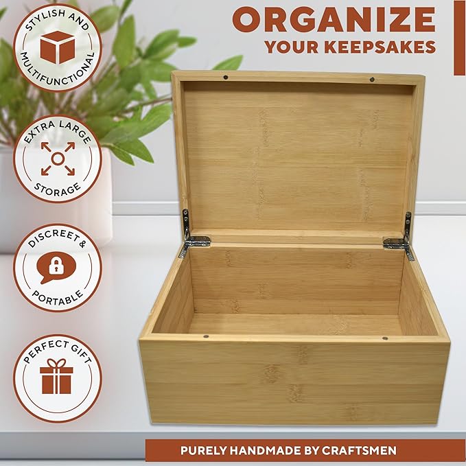 - Material: Large Christmas boxes decorative made of high-quality bamboo wood with smooth varnished surface, 100 degree durable & reliable metal hinges lock the lid in an upright position for more convenience