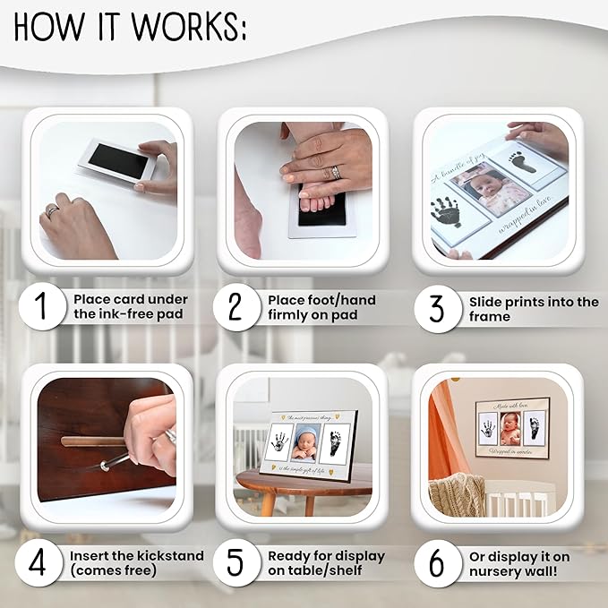 - NO HASSLE, NO MESS BABY KEEPSAKE - With lovely designs you can choose from, built-in acrylic cards to insert the prints to, a printed photo of your baby, no-mess inkpads for baby hand and footprints, this is the easiest way to capture your baby’s adorable prints forever. It comes with 4 print cards and 4 safe, no-mess ink pads, so you can try to get the perfect print more than once!