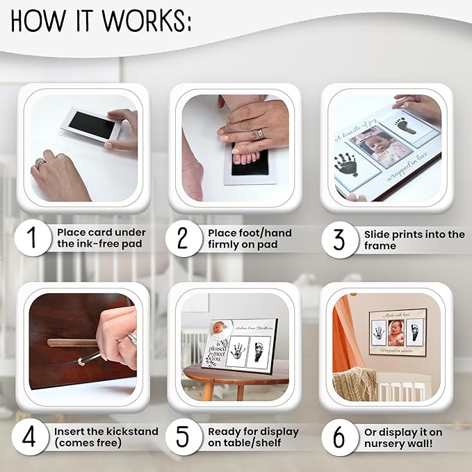 - NO HASSLE, NO MESS BABY KEEPSAKE - With lovely designs you can choose from, built-in acrylic cards to insert the prints to, a printed photo of your baby, no-mess inkpads for baby hand and footprints, this is the easiest way to capture your baby’s adorable prints forever. It comes with 4 print cards and 4 safe, no-mess ink pads, so you can try to get the perfect print more than once!