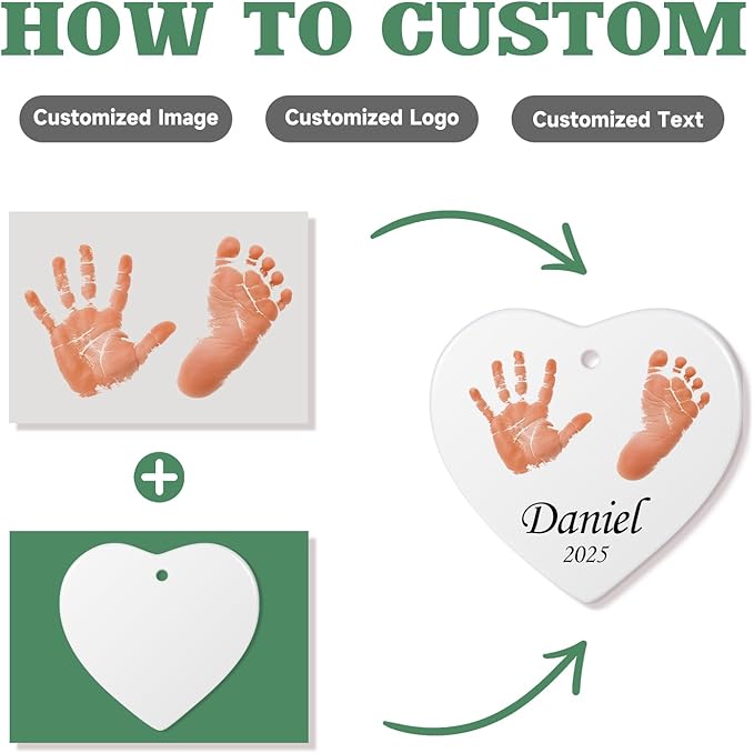 - FIRST CHRISTMAS ORNAMENT: Click "Customize Now" to upload a photo of your baby's handprint/footprint, add name and date. This personalized ornament is perfect for commemorating your baby’s first Christmas. It is suitable for both boys and girls. Personalizing your own ornament and celebrating baby's first Christmas with this cherished baby's first Christmas ornament 2025.