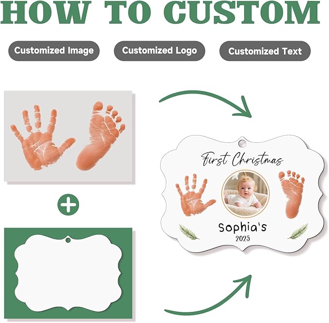 - FIRST CHRISTMAS ORNAMENT: Click "Customize Now" to upload a photo of your baby's handprint/footprint, add name and date. This personalized ornament is perfect for commemorating your baby’s first Christmas. It is suitable for both boys and girls. Personalizing your own ornament and celebrating baby's first Christmas with this cherished baby's first Christmas ornament 2025.